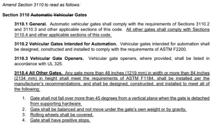 The amendment states that any manual or automated gate more than 48" wide or 80" tall must meet minimum safety requirements including: positive stops, covered wheels, and installed solutions that prevent the fence from falling more than 45 degrees from a vertical plane if it is detached from supporting hardware.